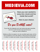 Print and post the flyers and business cards below around your town to let the world know about the great realm of Medievia! Great places to post flyers are bookstores, college campuses, comic book stores, gaming shops, hobby shops and anywhere else you think you might find fellow Medievians-to-be!